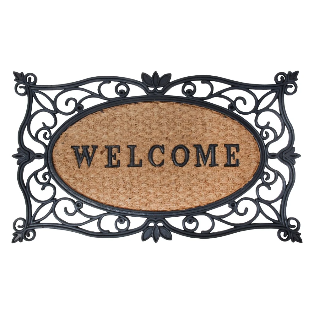 Deze rechthoekige deurmat is prachtig voor buiten of in huis. De deurmat heeft een klassieke Victoriaanse rand met sierlijke krullen. Het kokosgedeelte is voorzien van een tekst die de gast begroet bij binnenkomst. Door het robuuste en duurzame ontwerp en dankzij de rubber en de kokos borstels, wordt hardnekkig en grof vuil van het schoeisel verwijderd. Het voordeel van een rubberen deurmat is dat de mat niet wegglijdt.