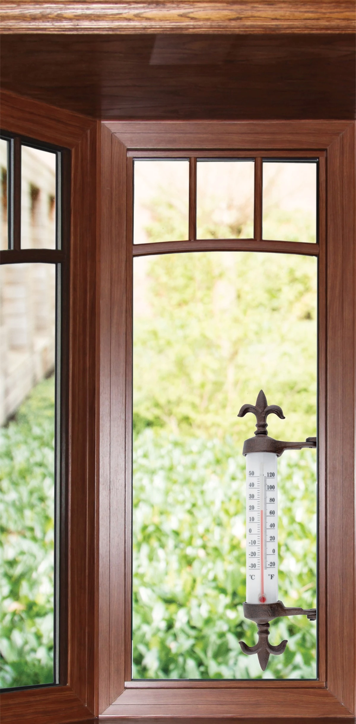 Wat handig, met deze kozijnthermometer is het mogelijk om van binnen de buitentemperatuur af te lezen. De thermometer wordt aan het kozijn bevestigd, en kan dan bijgedraaid worden om vanuit elke gewenste positie de temperatuur tussen -30°C en +50°C (-20°F en +120°F) af te lezen. Deze decoratief gietijzeren kozijnthermometer is per stuk met de hand gegoten volgens eeuwenoud vakmanschap en traditie.