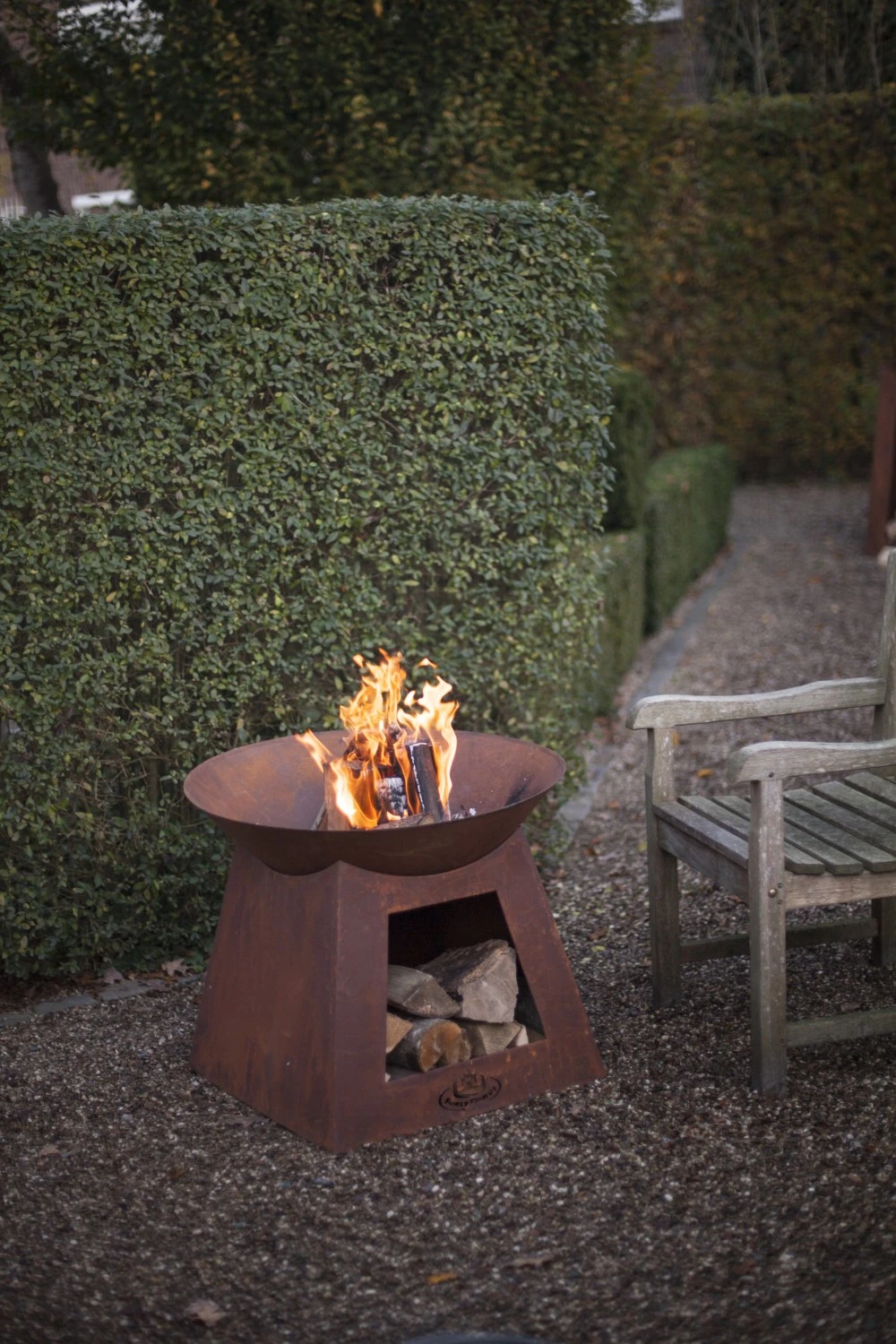 Wanneer metaal oxideert krijgt het een mooie en authentieke roestige uitstraling, bovendien zorgt vuur in de tuin voor een warme sfeer en is een echte blikvanger. Deze ronde vuurschaal met zijn stabiele voet zorgt voor ambiance en warmte rondom. De voet dient tevens als houtopslag. Bij gebruik zal het artikel onder invloed van vuur, weer en tijd verder gaan roesten waardoor het de patina nog authentieker maakt.