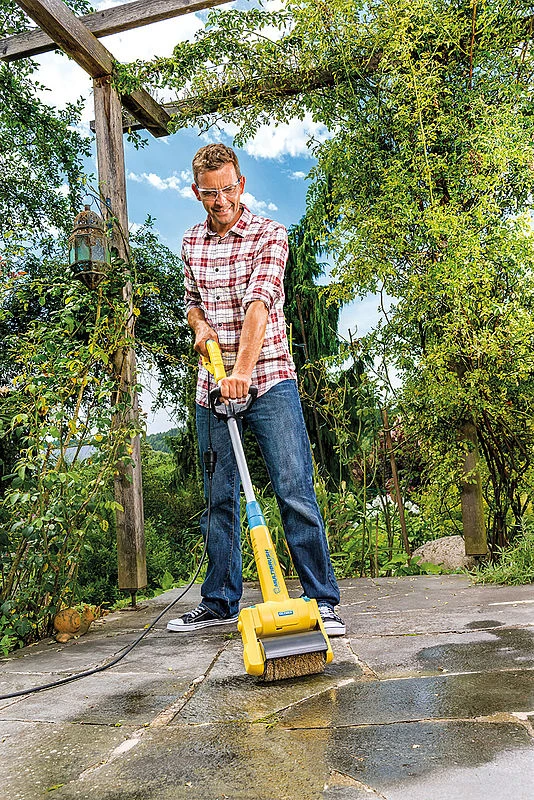 Op de Multibrush kunnen verschillende borstels gezet worden, er wordt een nylonborstel meegeleverd voor het reinigen van houten en stenen oppervlaktes, daarbij wordt er ook een staalborstel meegeleverd om voegen te reinigen. De kopstukken kunnen verwisseld worden door 1 druk op de knop, de Multibrush kan tevens worden gebruikt als graskantsnijder, het is dus een 2-in-1 graskantensnijder.